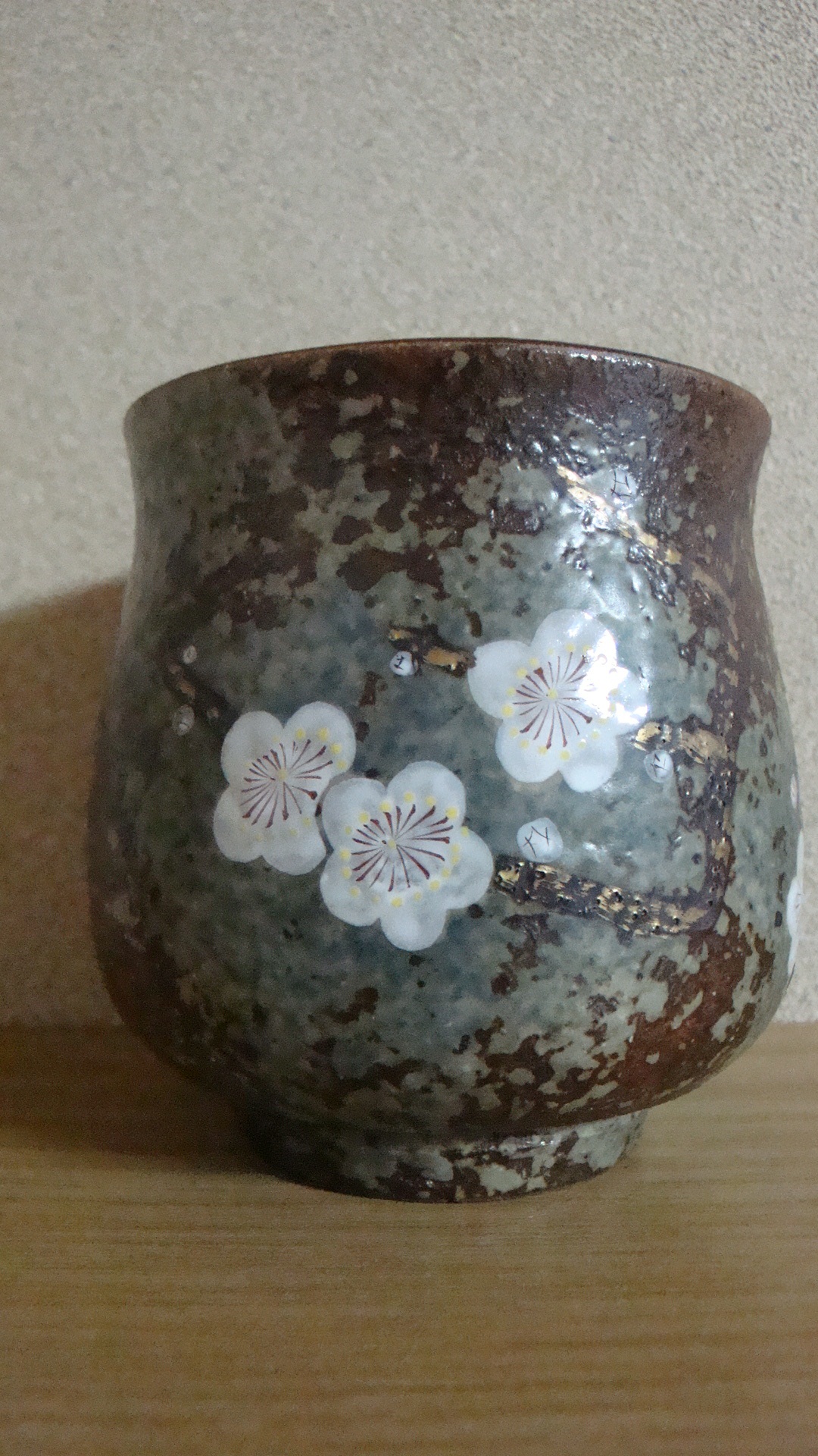 湯呑み(丸みのある焼き物)の花びらだけ、丸いので、白梅の可能性も。