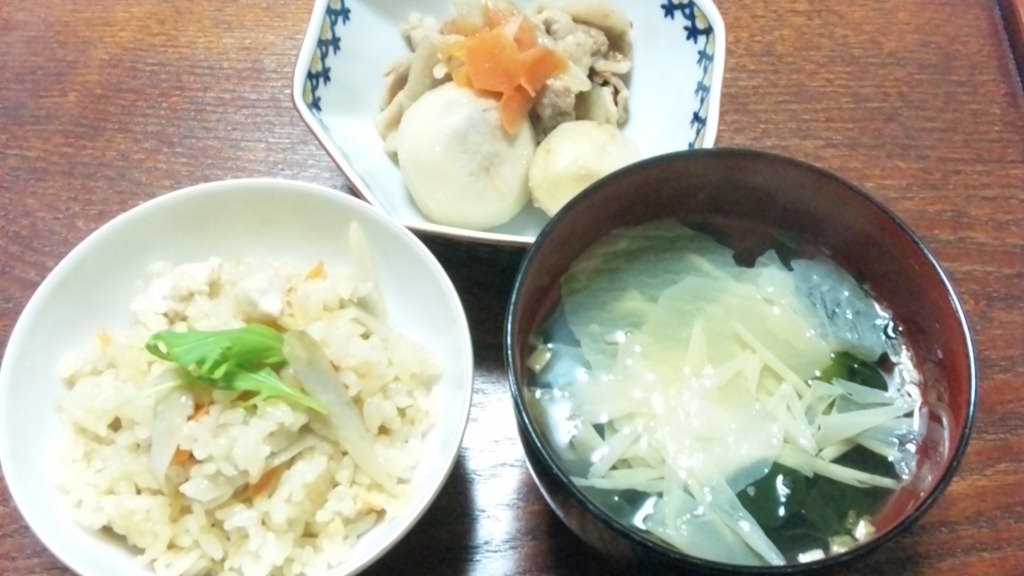 今日のお献立はトリ牛蒡たきこみごはんと小芋と豚肉の煮