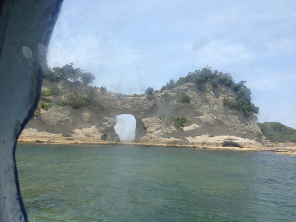 ↑ 円月島を背にしたこの船はグラスボート(白浜海底観光船)でございます。