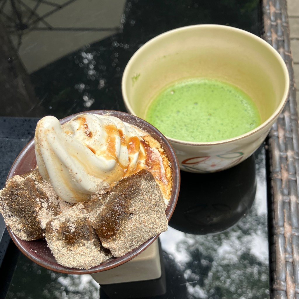お抹茶と信玄餅パフェ (熱海来宮神社 五色の杜にて)Matcha et Parfait du Shingen mochi(au Goshiki no Mori à Atami, sanctuaire Kinomiya)